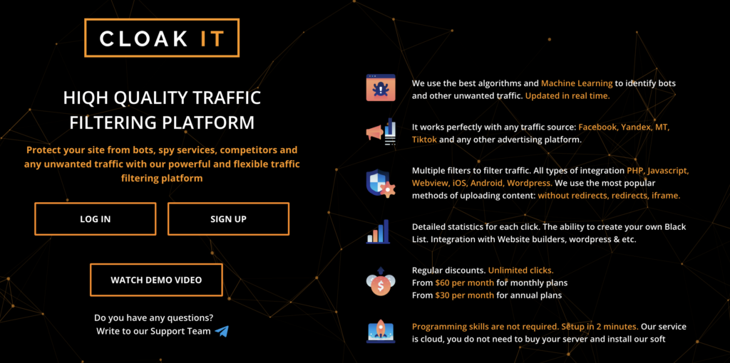 Cloaking House is a straightforward cloaking platform that offers three pricing plans, starting at $30 per month, with options for annual discounts. Its interface is user-friendly, making it easy for users to set up cloaked traffic flows. The platform has a built-in filtration system to block unwanted traffic and is compatible with VPN/Proxy blocking and IPv6 traffic filtering. Its database of over 400 detectable bots helps prevent moderation from platforms like Facebook and Google​.